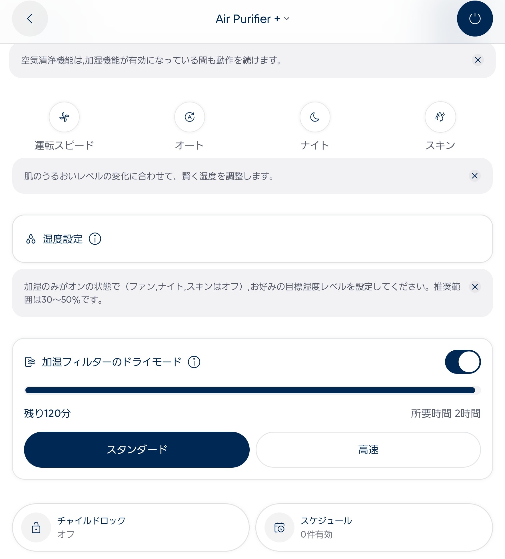 毎日使う加湿空気清浄機だからこそ、「手間を取らせない」「清潔を維持しやすい」という点は、家族全員の健康につながる大きなポイントです。また、オートドライモードも搭載しており、アプリからの操作だけでなく、加湿運転終了後、またはタンクが空になるとフィルターへ微風を当て、菌が繁殖しにくいよう乾燥させられるのもうれしい機能です。