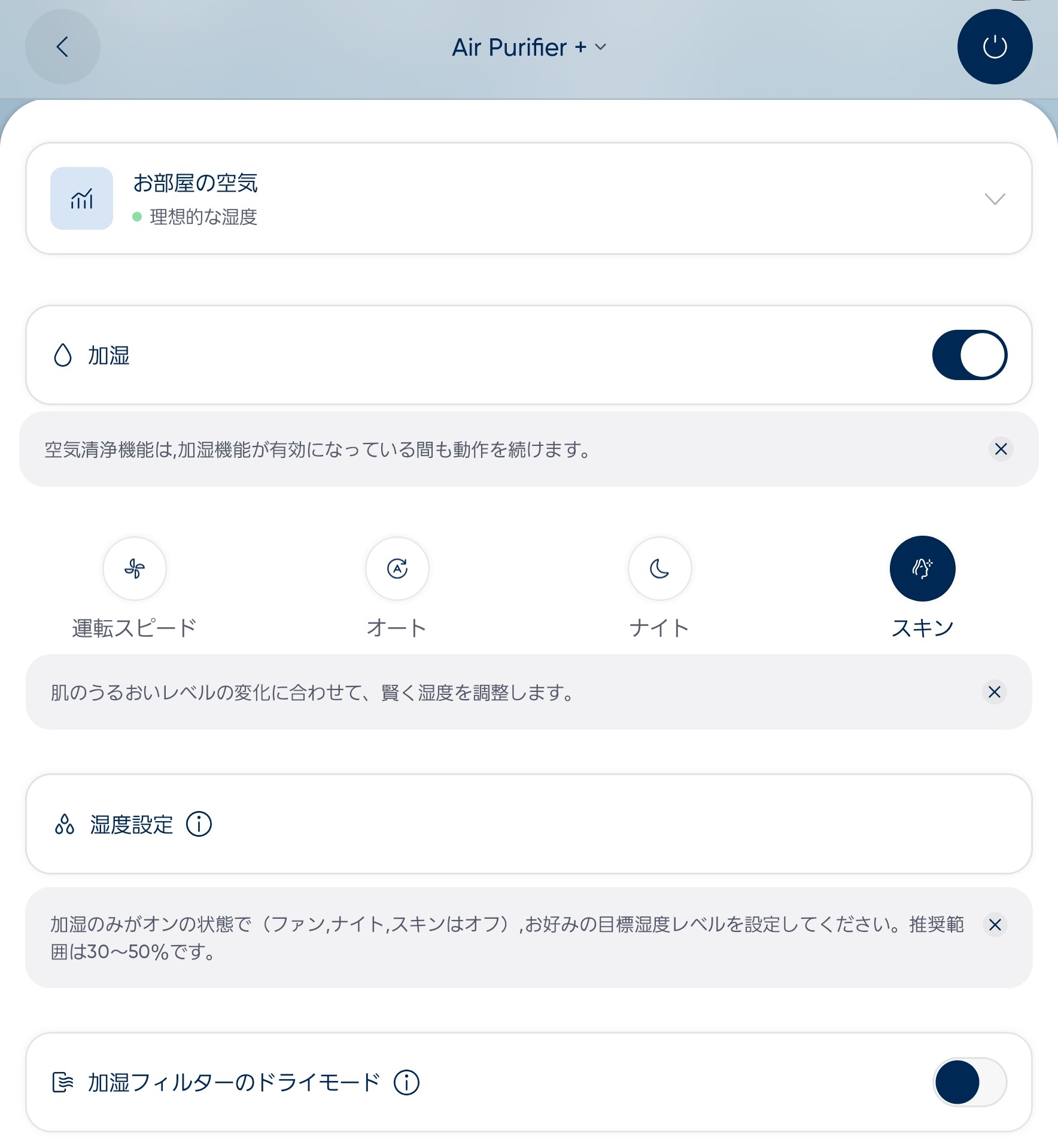 DH5iでは、室温・時間帯に応じた自動加湿制御機能「DermaSense™スキンモード」を搭載。これは単純に「湿度を上げる」だけではなく、過乾燥や過加湿を避けながら肌や呼吸にやさしい湿度を保つための工夫です。